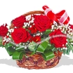 ДЕЛЮКС: роза красная - 11 шт., альстромерия красная - 5 шт., гипсофила - 5 шт., декоративная зелень, оазис, корзина большая, бант красный.
