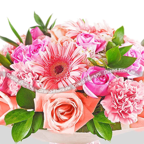 Стандартный: гербера розовая - 2 шт., роза аква - 3 шт., роза розовая - 4 шт., альстромерия розовая - 2 шт., гвоздика розовая - 4 шт., декоративная зелень, фетр розовый, бант розовый.